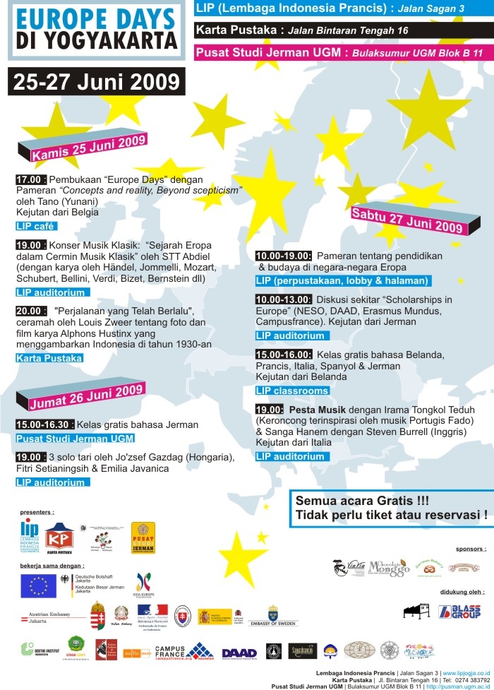 From June 25th to 27th, there will be the Europe Days di Yoygyakarta at the French Cultural Center (Centre culturel français / Lembaga Indonesia Prancis (LIP)), an expo where European products are shown.